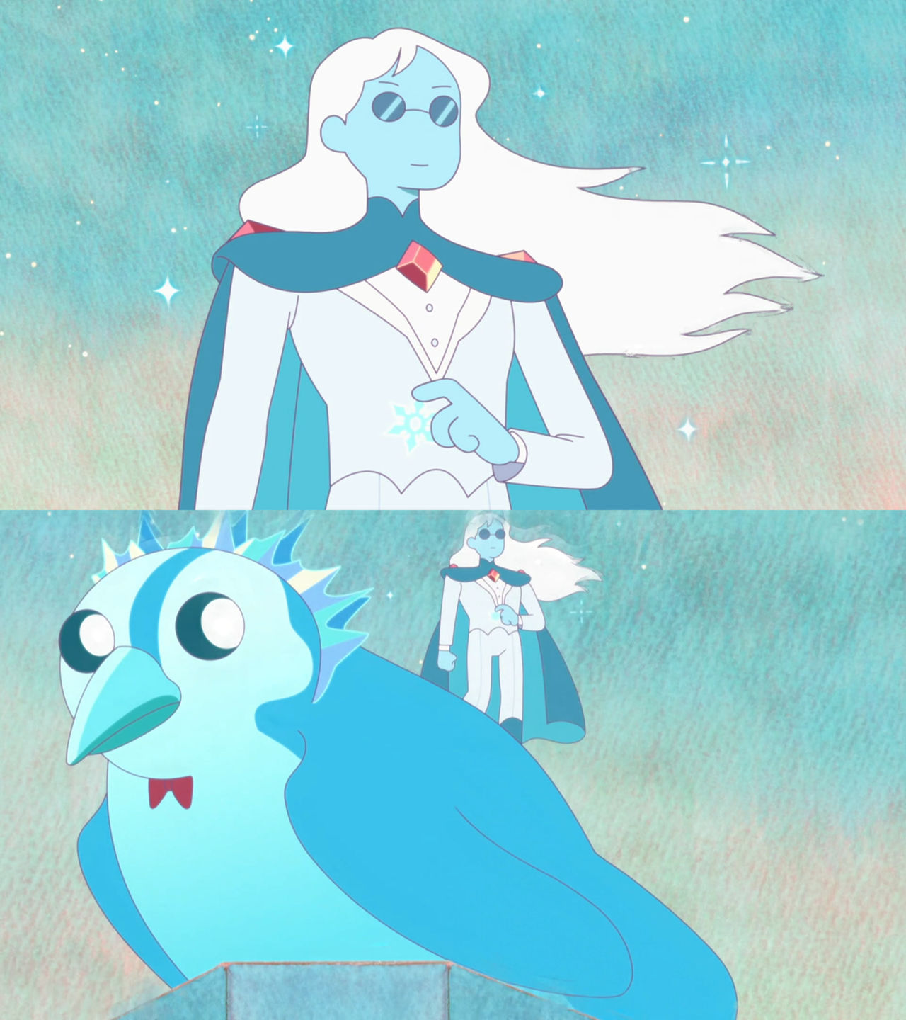 Ice Prince is a prince Fionna meets in her dreams. He has ice powers he uses to assist Fionna and rides a giant penguin. He bears a striking resemblance to the Winter King. He is a tall blue humanoid, with blue glasses, a white suit, a blue cape and a ruby ornament. He is a kind, gentlemanly man and is apparently very quiet. Ice King Ice Queen The Winter King