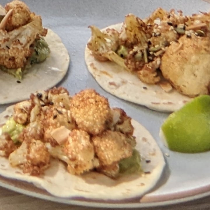 Salad toppers. Squid 6, Chicken 7, Falafel 7, Halloumi 7, ½ Avocado 6. TACOS. All served on 3 flour tortillas with lime wedge. Spiced cauliflower. Cauliflower, avocado, mixed nuts, old bay mayo gfo, df, v, vgo 15. Pork shoulder, 12 hour slow cooked pork, mango and habanero salsa df, gfo 17. Crumbed fish.