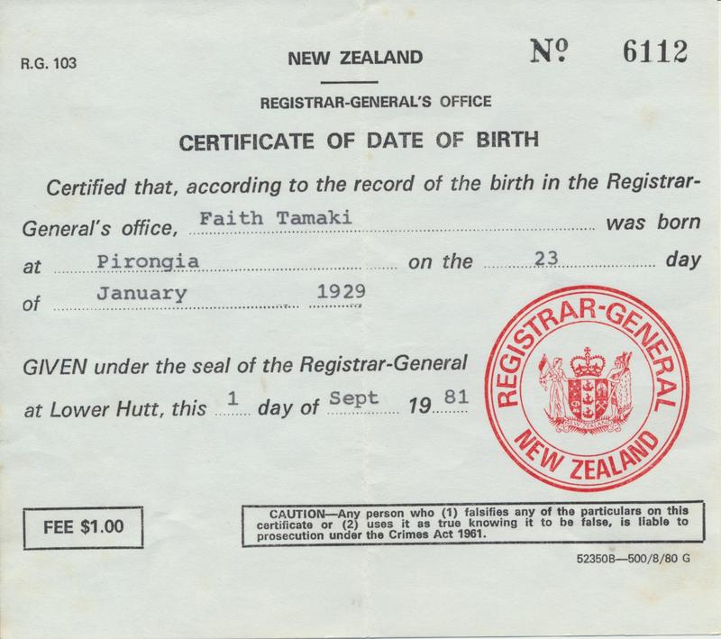 Faith Tamaki Birth Certificate Te Awamutu Museum