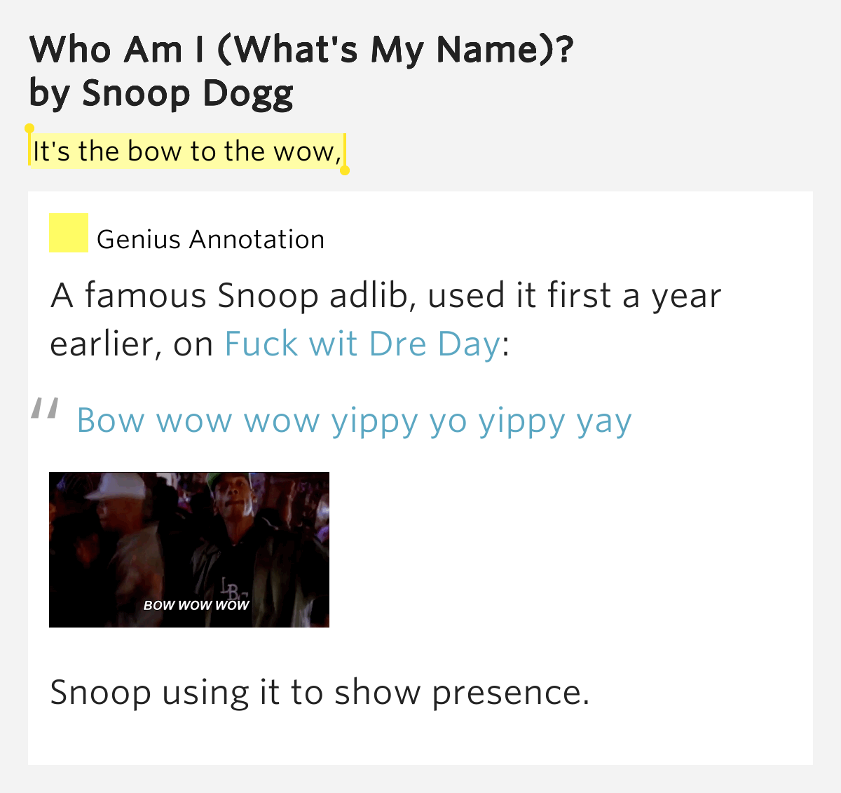 It's the bow to the wow, Who Am I (What's My Name)? by Snoop Dogg