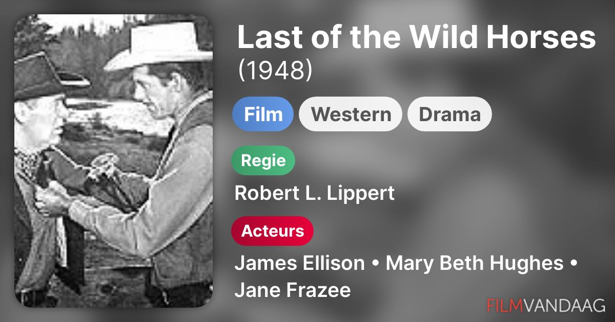 Last of the Wild Horses is a 1948 American Western film directed by Robert L. Lippert and starring James Ellison, Mary Beth Hughes and Jane Frazee. It was featured in episode 611 of Mystery Science Theater 3000. Plot. Duke Barnum, a rogue cowboy just outside of Jacksonville Oregon, appears to be planning to rob a stagecoach when he spots three.